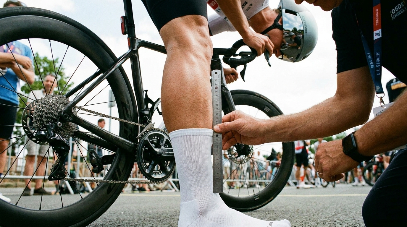 襪子之謎 (The Sock Rule): 沒錯,你沒看錯。UCI 有一條著名的規定:襪子的高度,不得超過選手腓骨(小腿外側那根骨頭)高度的一半。每次賽前,都會有裁判拿著特製的量尺,一個一個去檢查選手的襪子。